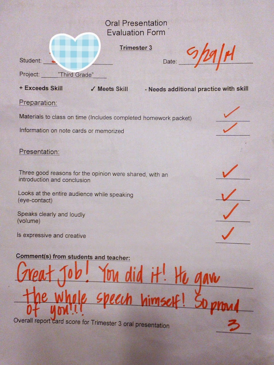 學期快結束了, 上週一放學弟弟說這週的 homework 就是下週 (也就是本週) 要做 oral presentation, 跟全班分享在三年級學習的心得. 我本來以為口頭分享只是嘴巴講一講而已, 應該用不到一週準備吧? 沒想到回家後弟弟從書包拿出一份 Oral Presentation 的資料. 有大綱, evaluation form, 和空白練習卷.