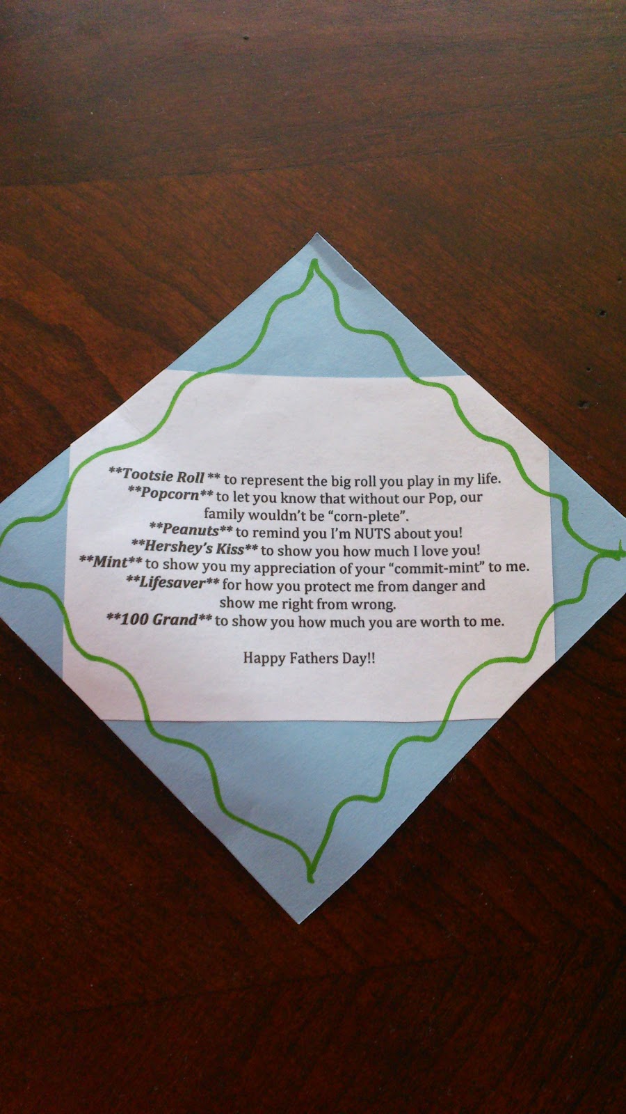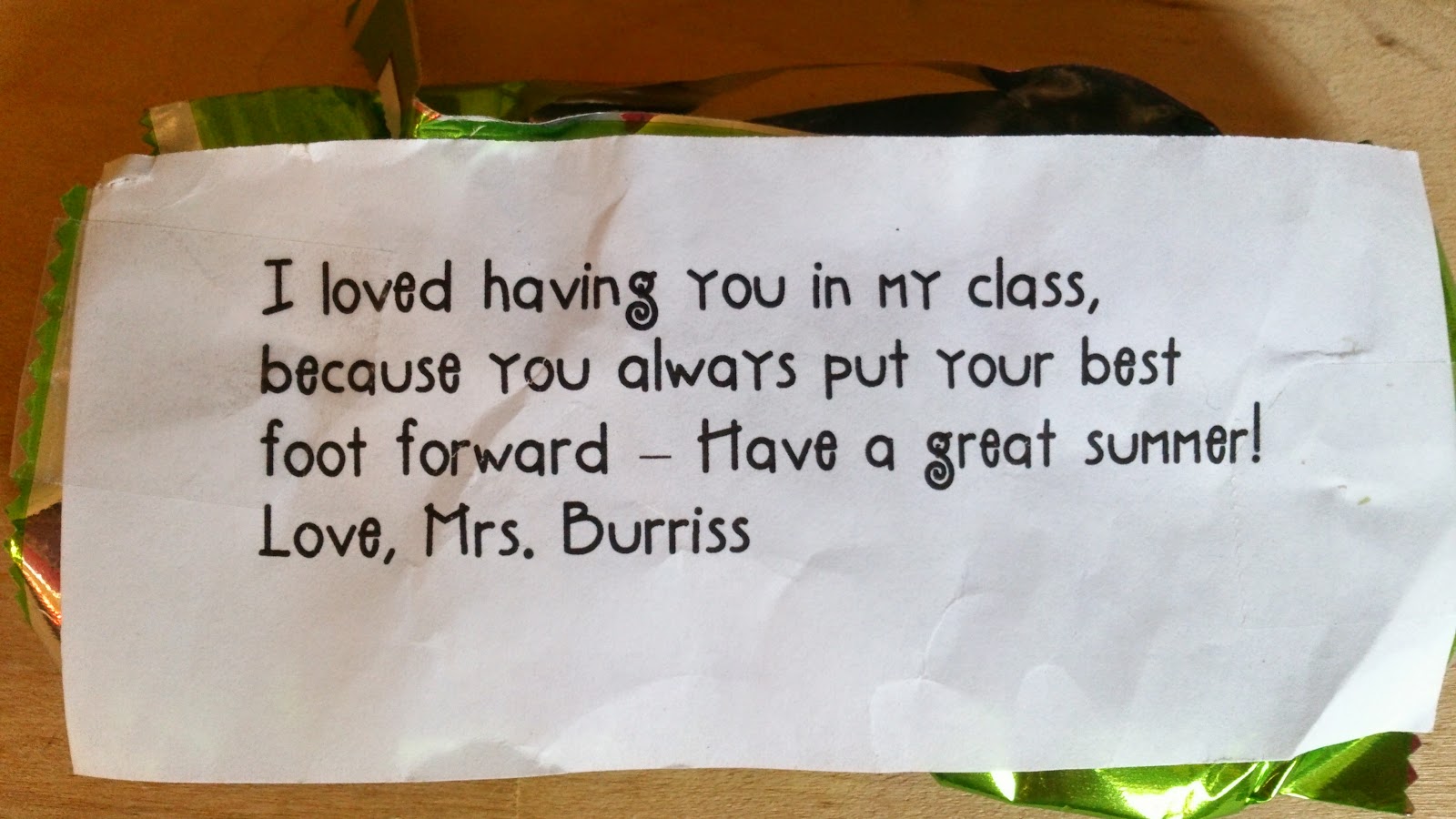 發現其實美國人很喜歡這樣以物寓意. 弟弟最後一天上學也帶回一張老師送給他的 note, 貼在糖果上